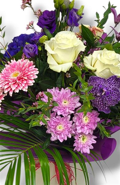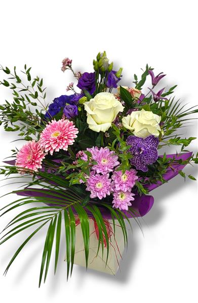 A seasonal selection of mixed flowers in shades of purple and pinks with a twist of white including gerbera, rose, hydrangea, carnation and lisianthus.