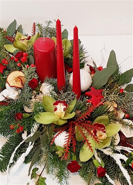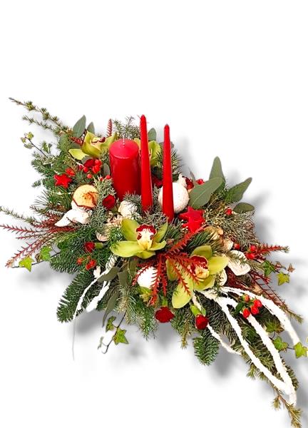 Traditional Christmas centrepiece with mixed candles and seasonal decoration in reds, greens and white.