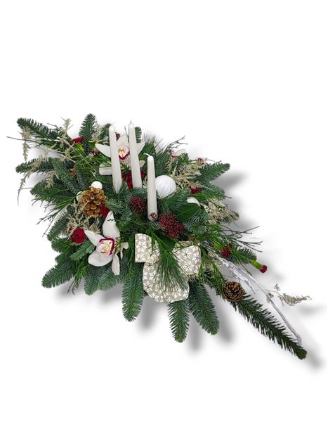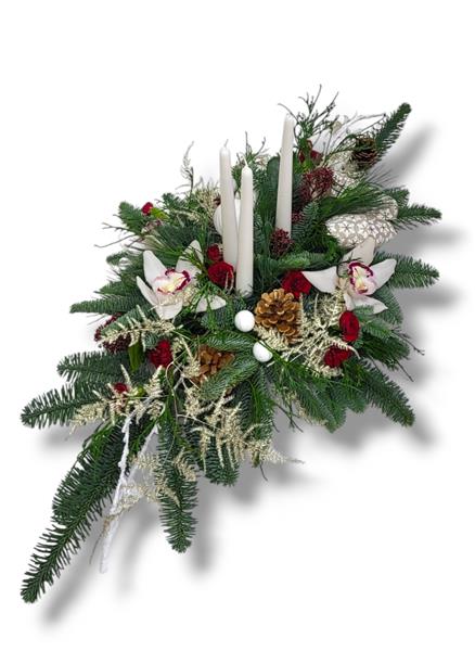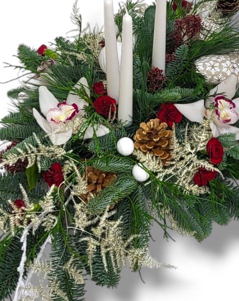 A long table centrepiece arrangement with white candles, white flowers with seasonal decoration giving a very snowy Christmassy effect