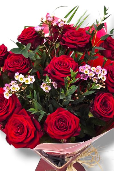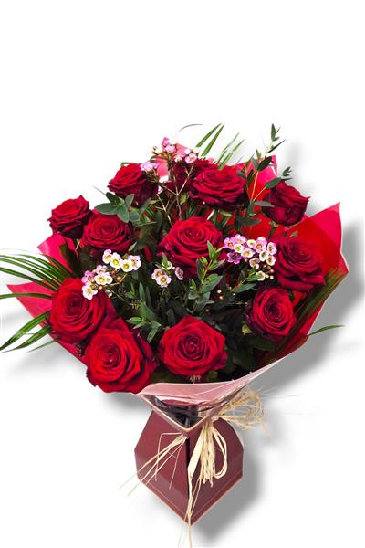 A dozen beautiful long stemmed velvety Red Naomi roses presented in box. A classic romantic bouquet.