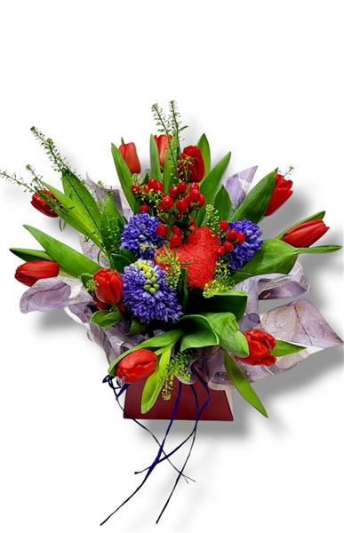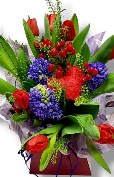 Spring bouquet in reds and blue, including tulips and hyacinth completed with Valentine's heart.