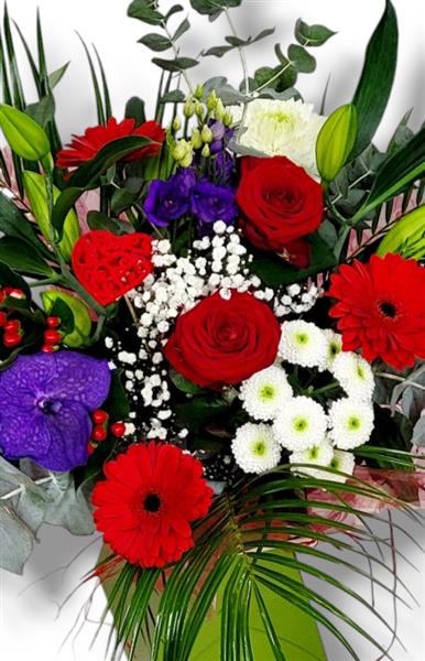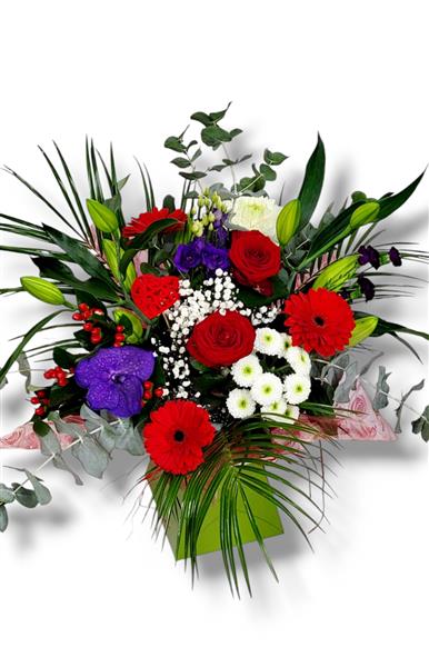 An elegant mixture of roses, lilies, lisianthus, gerberas, orchid and seasonal foliage. The perfect gift