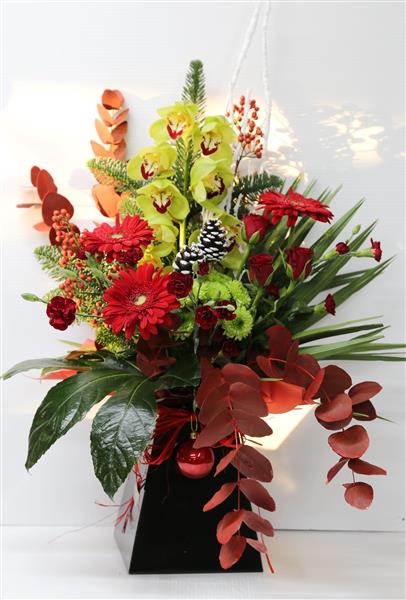 A stunning, tall cymbidium orchid surrounded by a seasonal selection of blooms and foliage, handtied in a nicely presented box. Available in different colors.