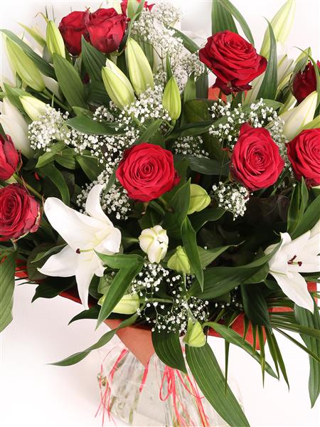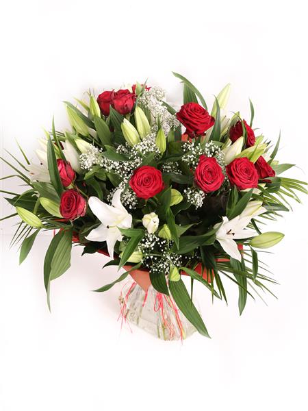 12 long stemmed red roses and 12 white lilies with gyp and foliage.