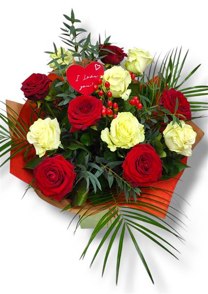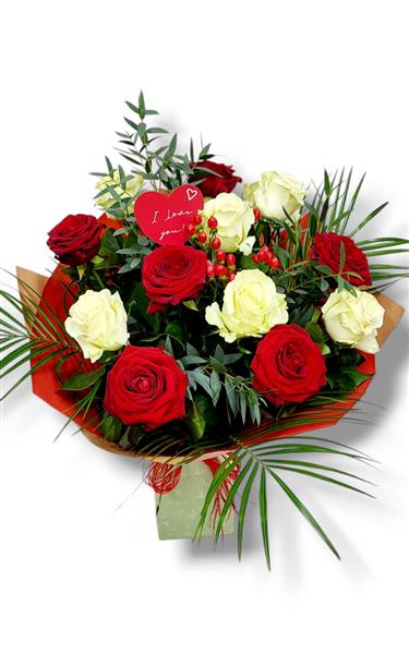 A mix of 12 large head white and red roses, loosely hand tied and beautifully gift wrapped and delivered aqua packed in water for extra freshness.