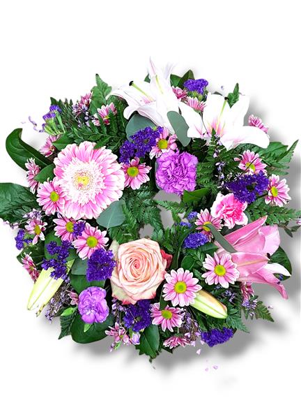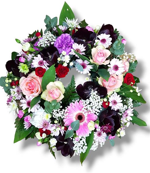 Round wreath with rose, gerbera, carnations, chrysanthemums and greenery.