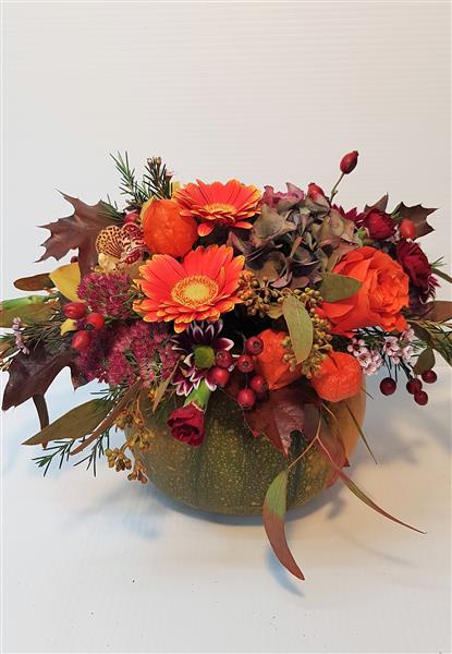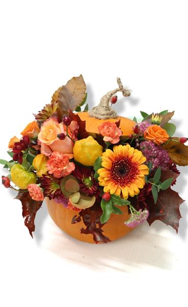 A very pretty arrangement of autumn flowers in a pumpkin.