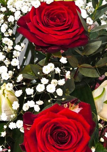 Long stemmed red roses with white lilies and seasonal foliage.