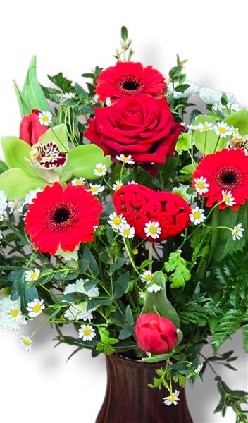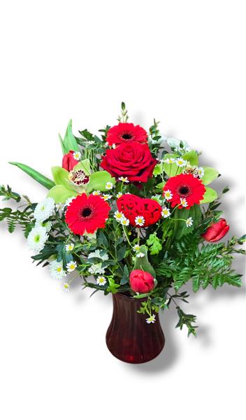 A fresh, compact hand-tied bouquet including rose, orchids, gerberas, tulips and decorative foliage in a nice red glass vase.