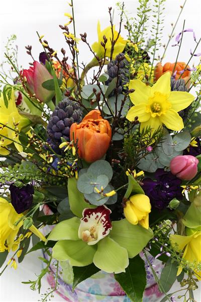A beautiful Hat Box filled to the brim with a fabulous combination of spring flowers and foliage.